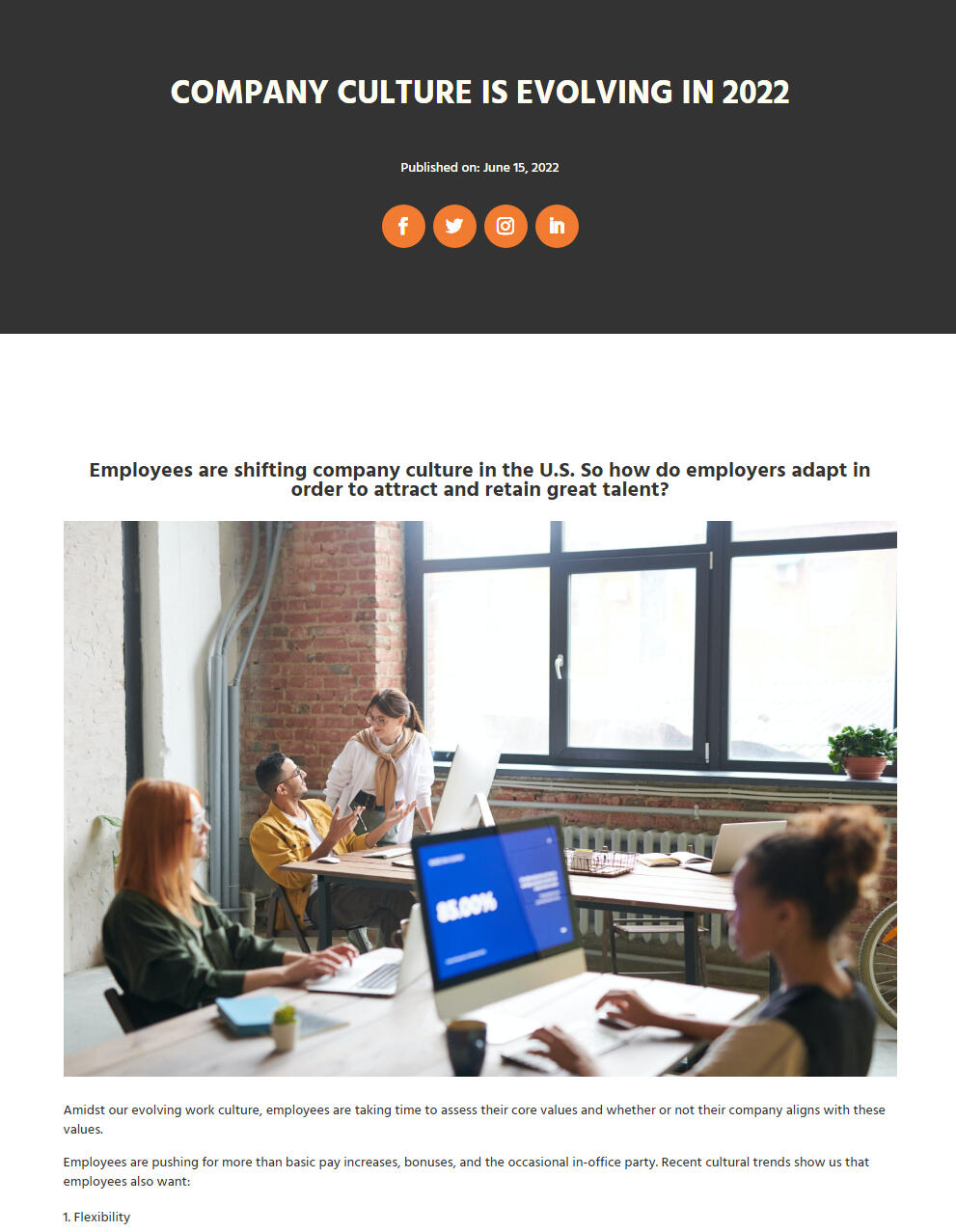 Created a blog post regarding the evolution of company culture in 2022 and how employers can adapt to attract and retain great talent.